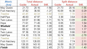 So rather than believe the race guide numbers, plan your splits according to the “Actual” columns. Both cumulative and split distances are included in the table.